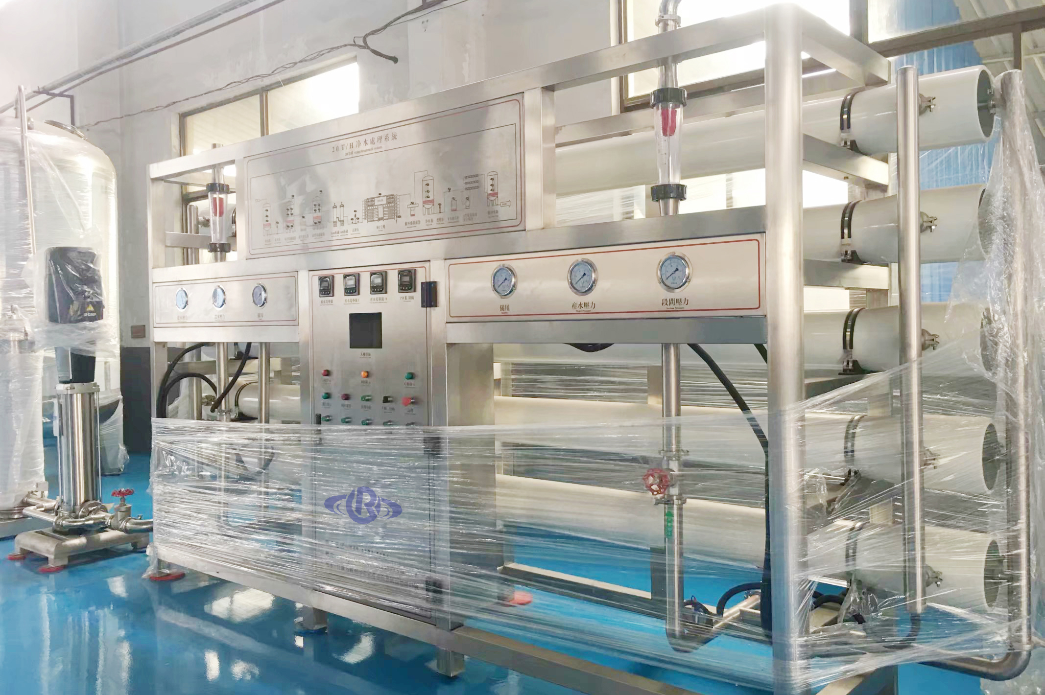 第一级预处理系统:采用石英砂多介质过滤器,主要目的是去除水中含有的泥沙、锰、铁锈、胶体物质、机械杂质、悬浮物等颗粒在20UM以上对人体有害的物质。自动过滤系统采用进口富莱克控制器,可以自动进行反冲洗、正冲洗等一系列操作。同时,设备具有自我维护系统,运行费用低。滤材主要包括:PPF,AC椰碳等。