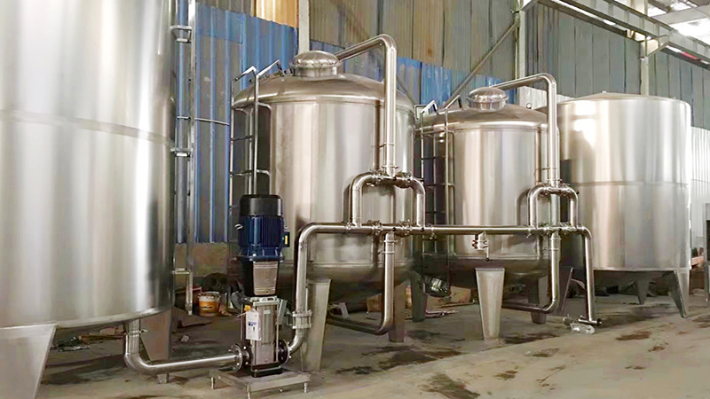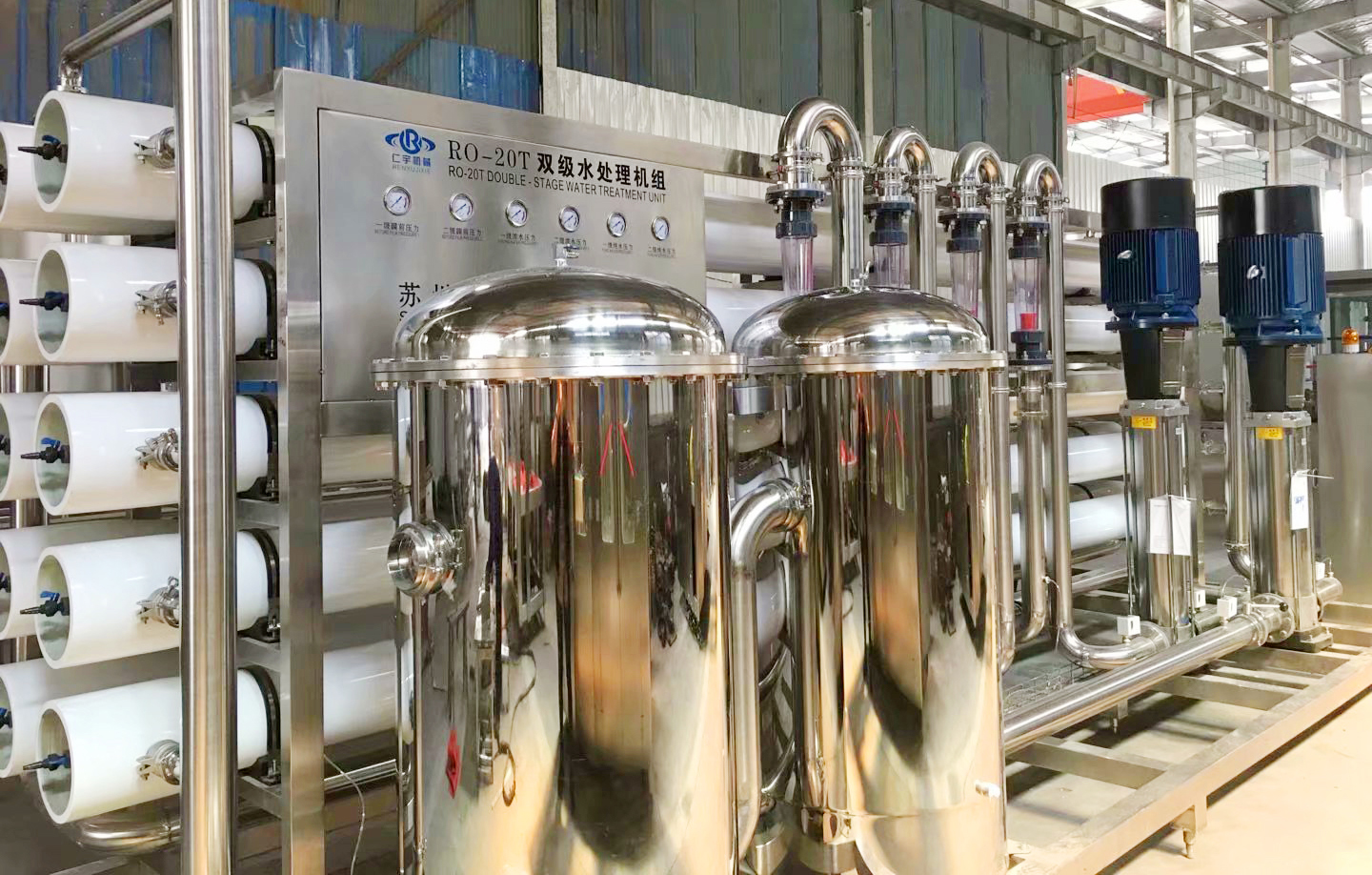 原水(自来水、地表水、地下水)加压送至预处理系统粗过滤,再进入精密过滤器过滤后,通过一级高压泵加压送至一级反渗透系统,该系统产出的水再由二级高压泵加压送至二级反渗透系统,生产出产品水,称为双级反渗透。