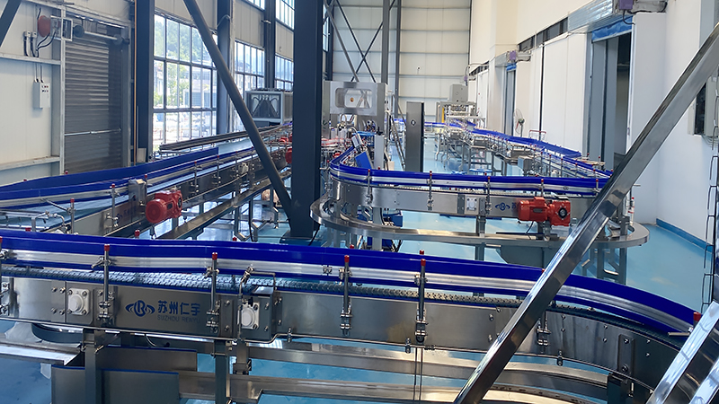 在冲洗机冲洗的指定段,水会从专用喷嘴喷出,冲刷内壁的瓶子。冲洗和滴水后,瓶夹夹住的瓶子沿导轨再转180度,恢复瓶口朝上。