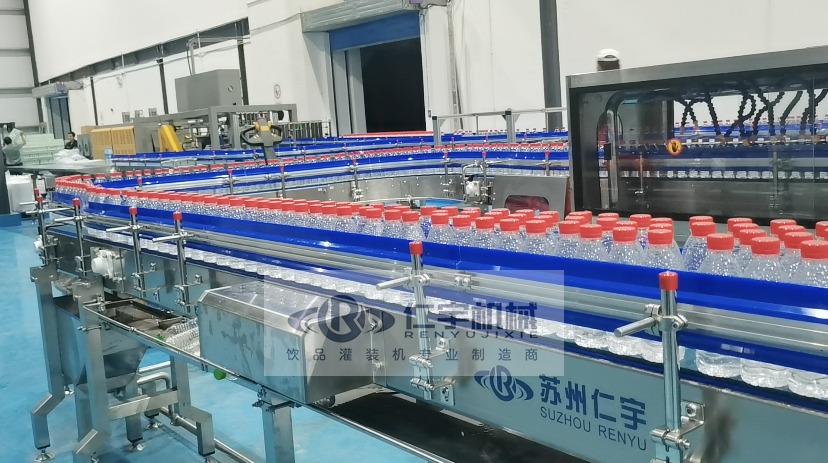 清洗过的瓶子通过星轮从冲洗机中移出。进入灌装区后,瓶子由颈部支撑的托板固定,托板由托瓶机构驱动,将瓶子抬起以与灌装阀接合。