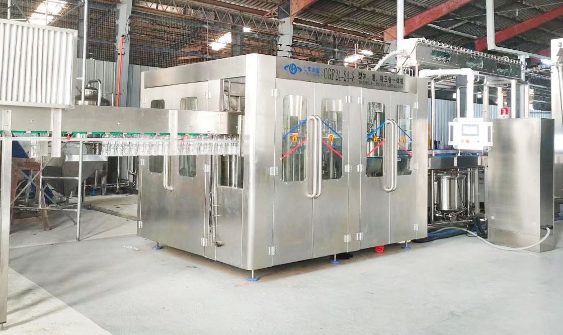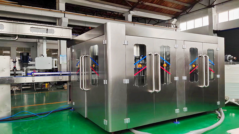 PET bottled mineral water production line process: water treatment system → bottle blowing machine → bottle sorting machine → air supply channel → three in one filling machine (bottle washing, filling, capping, including upper capping machine, online cap disinfection) → light inspection box → labeling machine (labeling) → shrinking machine → coding machine → film packaging machine (packing machine) → palletizer → finished product