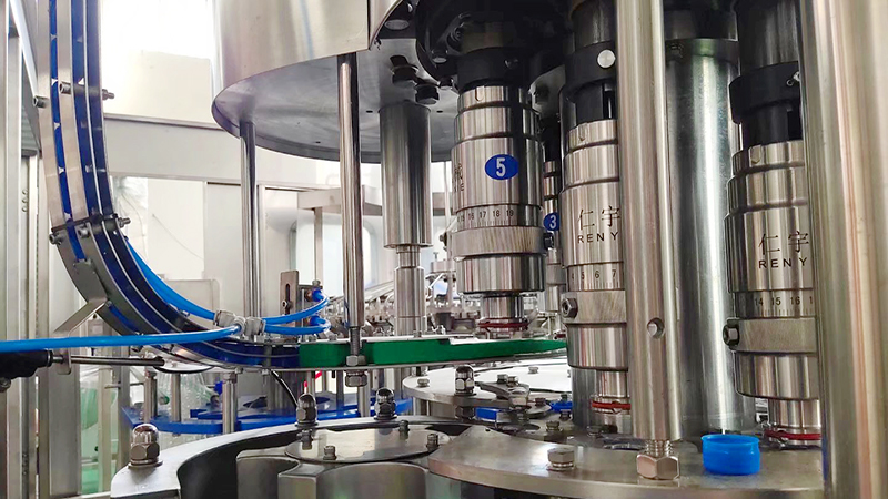 After the capping and filling is completed, the bottle enters the capping machine through the transmission star wheel, and the anti rotation knife on the capping machine blocks the bottleneck, which together with the external bottleneck guard plate of the capping machine keeps the bottle upright and prevents rotation. The capping head rotates and rotates under the driving of the capping machine's main shaft. Under the action of the cam, the capping head can realize the actions of grasping, capping, capping and decapping, and complete the whole capping process. The capping head adopts a magnetic constant torque device. When the capping head takes off the cover through the capping disc, the top cover sleeve will hold the cover and straighten the cover to ensure the correct position of the cover in the capping die and the quality of the capping. When the capping is completed, the capping head overcomes the magnetic slipping and will not damage the cap. At the same time, when the capping head rises, the top cap rod will eject the cap from the capping die.