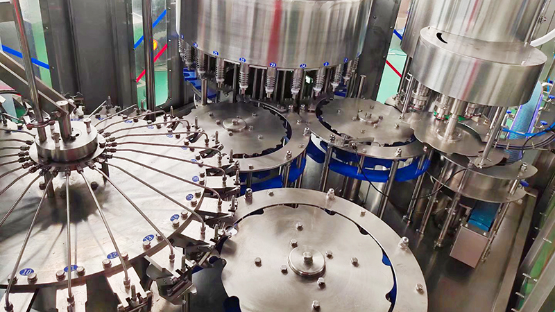 The bottle that is filled and rinsed is led from the bottle washing section to the filling section through the bottle pulling star wheel Bottles entering the filling section are forked by the bottle neck, and can be lifted, maintained and lowered by the lifting mechanism under the action of the cam. During the operation, the bottle is jacked open by the filling valve, and filled by the closed filling method. The output adjustment is controlled by the frequency converter. The high-speed filling valve is used to control the liquid level accurately with small error.